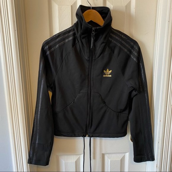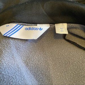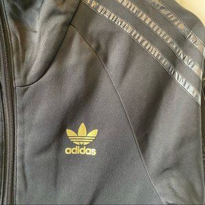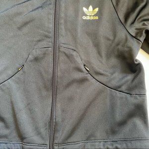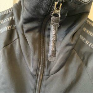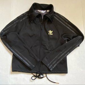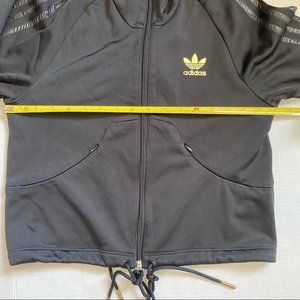 Adidas track jacket satin back drawstring vent 3 black satin stripes gold trefoil size small.