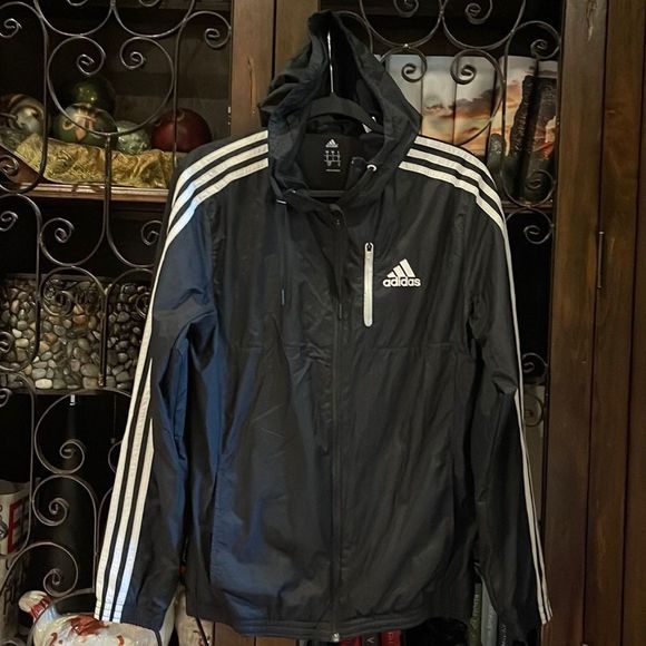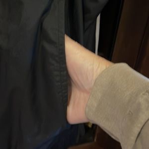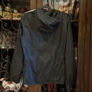 Hood on top. Chest pocket in white that zips. Two large pockets at waist. US size small but is oversized.