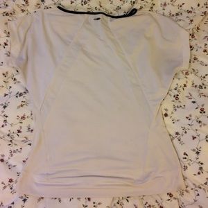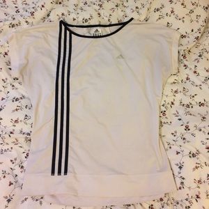 This is a white Adidas workout top, size medium. It has always been to big for me, it's from my tennis playing days in high school four years ago. It matches the adidas athletic skirt I also have listed in my closet. The shirt has been worn only a handful of times and has no stains. It features a mesh pattern on the back, and the sleeves are built for movement (tennis)