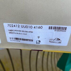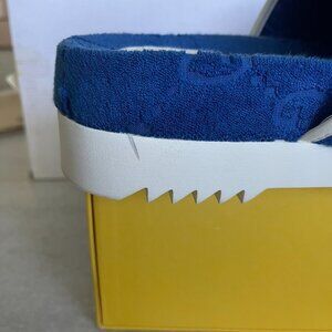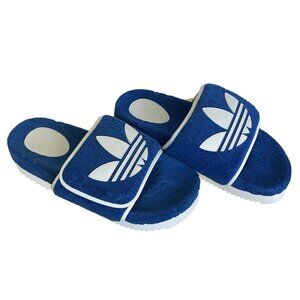 Adidas X Gucci men's slide sandals in blue/white. The GG Monogram pattern and Trefoil Demetra patch accents give these shoes a trendy 80s/90s theme, perfect for travel, activewear, parties, or casual wear in the summer and spring. The adjustable Velcro strap closure ensures a comfortable fit for US shoe size 9.5 (EU size 42.5).