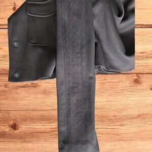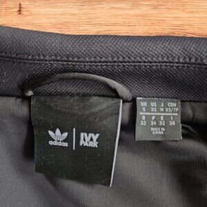 This Adidas x Ivy Park cropped blazer features a sleek black design with eye-catching gold stripes on the sleeves. Made from high-quality materials, it combines sporty style with a chic, tailored fit. Perfect for adding a touch of streetwear edge to any outfit.