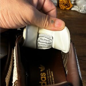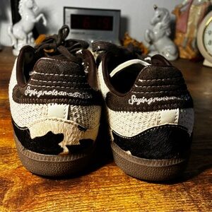 Adidas sneakers with a black and white cow print design. Features classic stripes and textured design.