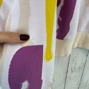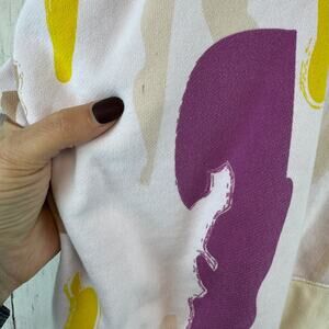Flaws: There is a small hole and mark on the sleeve. The white area has somewhat of a pink hue to it. I believe the purple bled onto the white. Please review photos carefully for imperfections stated.