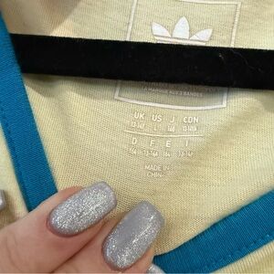 Adidas dress with yellow and blue design. Features iconic logo. Casual and stylish.