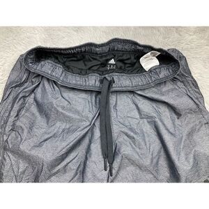 Adidas 3 stripe nylon grey track pants with two front pockets, drawstring waist band, polyester lining, and zippers at ankles.