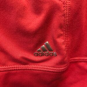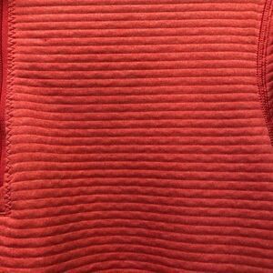This pullover is in excellent pre-owned condition. It zips at the top to create a funnel neck collar. The sleeves have thumb holes, to hold the sleeves down while exercising. The top has a quilted striped pattern on it, and there are two pockets in the front.