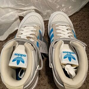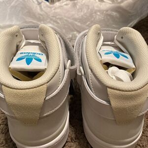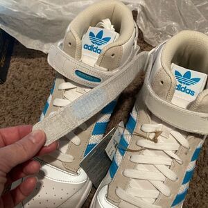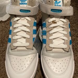 The Diego Nájera x Forum 84 Mid ADV 'City of Angels' is an exclusive colorway that takes inspiration from the team rider's Los Angeles hometown. The vintage basketball shoe is updated with a skating construction, built with a white leather base and supported by mesh on the quarter panel for breathability. Suede marks the eyestay, while Signal Cyan accents the Three-Stripes on the side wall. An adjustable ankle strap helps secure the fit, while underfoot, the rubber cupsole includes an exposed foam wedge on the medial side for cushioning. Diego Nájera's name in script lettering appears on the icy translucent rubber outsole, which offers traction.
