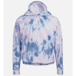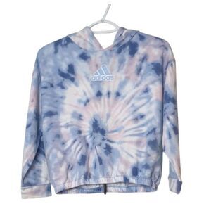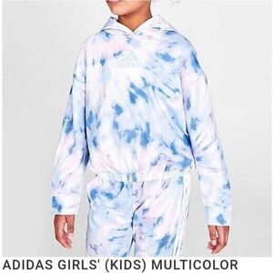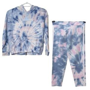 kids tie-dye set, Adidas hoodie, leggings set, Adidas kids clothing, tie-dye pattern, kids activewear, cotton blend set blue pink outfit, pullover hoodie, Adidas logo, elastic waistband, medium size, Adidas girls 2 piece set, Adidas girls jogger set,