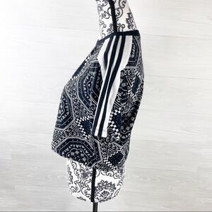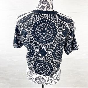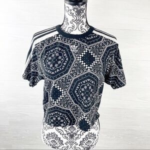 Adidas Kaleidoscope printed cropped top size medium. Black and white kaleidoscope cotton/Elastane blend material with stretch. Short sleeves with ribbed crewneck collar. Signature 3 stripes on shoulders and modern cropped length. Single Jersey fabric that is soft, lightweight and breathable. Adidas logo on front and Trefoil graphics. No holes or stains. Retro vibe!