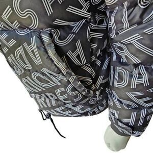 Adidas Neo women’s puffer jacket, size Medium. Features an allover bold Adidas/3 Stripes logo print in black and white with a modern streetwear look. Insulated with high-quality 70% grey duck down (180g weight) for exceptional warmth without bulk. Designed with a full zip front, high collar, ribbed cuffs and hem, adjustable drawcord waist, and side pockets. Shell and lining are 100% polyester (lining is recycled). Perfect for cold weather, casual wear, or layering. Like new, never worn condition with no holes, stains, or major flaws noted.