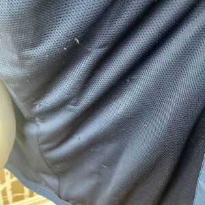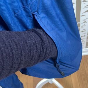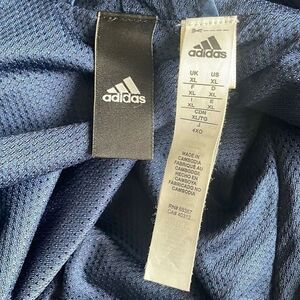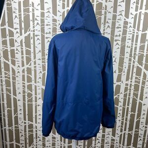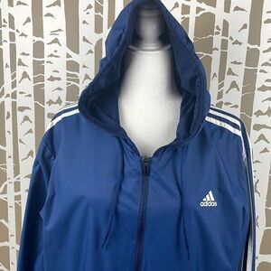 Adidas Navy Blue Hooded Zip Up Windbreaker Jacket sz XL. Features lightweight nylon/polyester windbreaker fabric with breathable mesh lining, full zip front, hood with adjustable string ties, fully functional zip close front pockets, elasticized hemline and cuffs, classic 3 stripes down the shoulders and sleeves. Gently worn and laundered with some snags on the lining material, which are not visible when jacket is on (see pic) - no other flaws to note. Grab yourself a sweet new to you jacket for the gym and get ready to make your New Year's resolutions a reality!