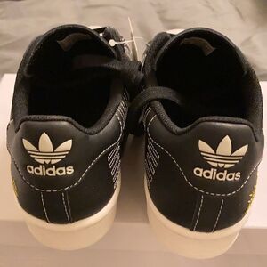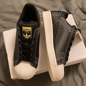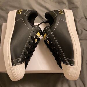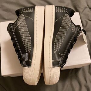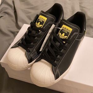 Black with white stitching designs and pops of yellow stitching and logo on tongue.