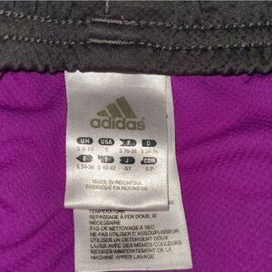 Pretty purple and white athletic shorts by Adidas. They don't have pockets, but they do have a drawstring waistband.