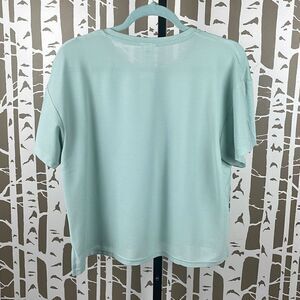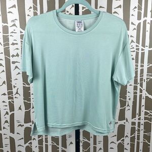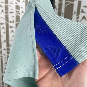 Adidas Sea Foam Green Split Sleeve Semi-Sheer Back T-Shirt sz S. Features a pretty sea foam green smooth fabric in the front (69% modal, 27% polyester, 4% spandex) with a horizontal ribbed textured semi-sheer fabric in the back (93% polyester, 7% spandex), boxy oversized fit, side split hemline, splits down center of sleeves with cobalt blue brand logo ribbon accents, crew neckline, rose gold Adidas logo on front left hemline. Brand new without tags and no flaws to note. Grab yourself a cute new top for the gym and get ready to make your New Year's resolutions a reality!