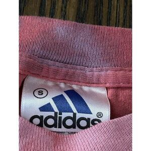 This vintage Adidas T-shirt features a vibrant red and purple tie dye ombre pattern with the iconic Adidas logo as an accent. The shirt has a crew neckline, short sleeves, and is made of 100% cotton knit fabric. It is a regular fit, machine washable, and has double-sided printing.