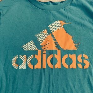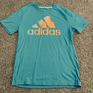This is a blue Adidas graphic t-shirt featuring the iconic logo in a distressed style. Made from a cotton-polyester blend, it offers comfort and durability.