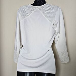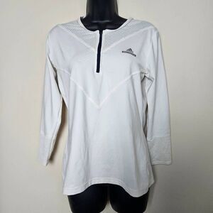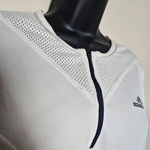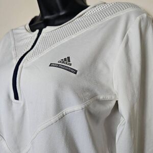 This is the Barricade style athletic shirt by Adidas by Stella McCartney. It has mesh detailing and a zipper on the chest. There is additional mesh detailing on the cuffs and back.
