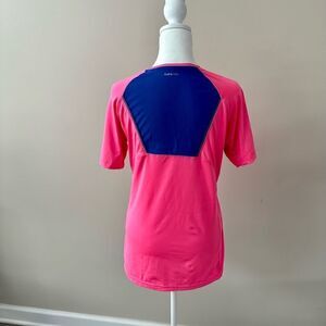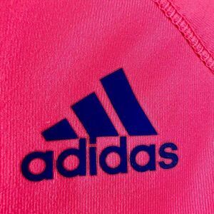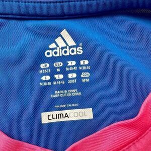Sporty neon pink t-shirt by Adidas with ClimaCool features. Royal blue front logo and top back in a breathable semi-sheer fabric. Length 26”, Width 18” pit to pit.
