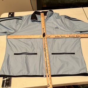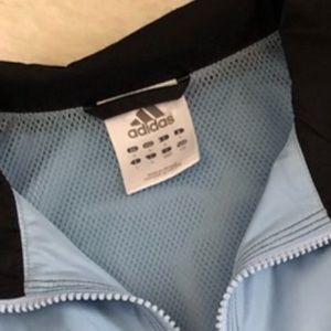 Adidias size large blue windbreaker with back vent & pockets light blue w/ navy strips