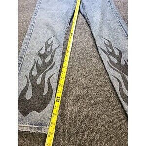 The Adika Jeans Women's Size 4 Small 28x28 Straight Leg Flame Graphic Faded Denim are a stylish and trendy pair of jeans featuring a unique flame pattern design. Made from 100% cotton denim with a stone wash, these jeans have a comfortable regular fit with a straight leg style. The zip closure and logo accents add a touch of flair to these distressed jeans, perfect for a casual, streetwear look. Ideal for women who appreciate biker and American themes, these jeans offer both comfort and style with a nod to 90s fashion. BIN 75-10