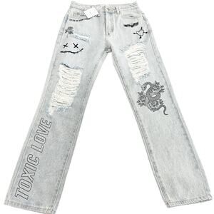 Adika Light Wash Tatto Ripped Graphic Denim Jean Zip Fly Straight Leg Size M NWT