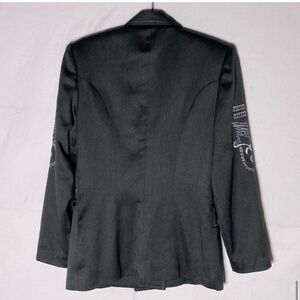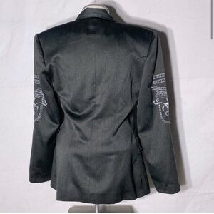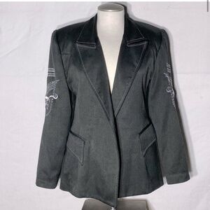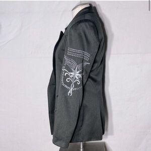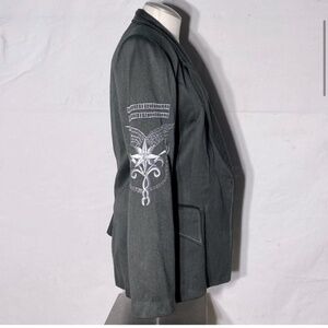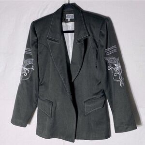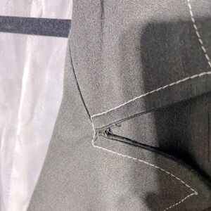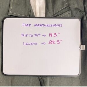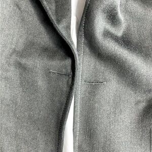 Great used condition. Minor signs of wear shown in pics. There’s no button, just two button holes. Never did have a button. Colour is greyish green. Feels like nice quality. No material or size tags. Cannot confirm material content and won’t guess. Size M chosen based on measurements in pics and fit.