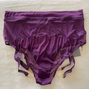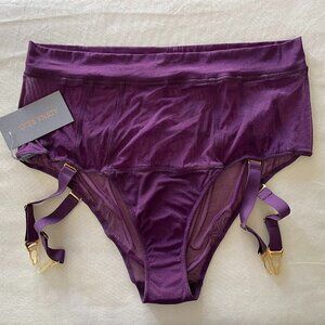 Stylish and flattering, yet comfortable, "Fran" shorts in a deep purple stretch tulle. Colorway is "called Aubergine". Retro/Pin-up/Boudoir-inspired high waist panties - with "seams" and fully detachable suspenders. Gold-toned hardware adjusters and clips. Mesh waistband that won't dig or irritate and cotton gusset for comfort. Sheer, lightweight fabric.