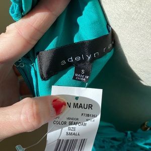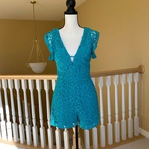Super cute mini romper in a beautiful green color. Worn only one time with lots of life left!! The photos in the direct sunlight better reflect the real color of the romper.