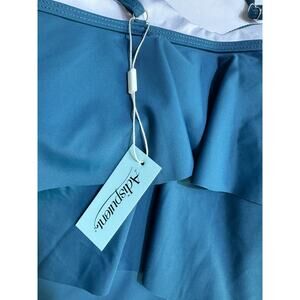 Make a statement by the pool or at the beach in this stunning two-piece Adisputent bikini. The high-waisted swim bottom provides a comfortable and flattering fit, while the flounce halter top adds a touch of playful elegance. The teal color and solid pattern make this bikini perfect for a day in the sun.