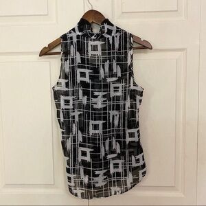Sheer, Adiva, Academia Style, Black & White, Abstract Print, Tie Neck, Sleeveless Blouse