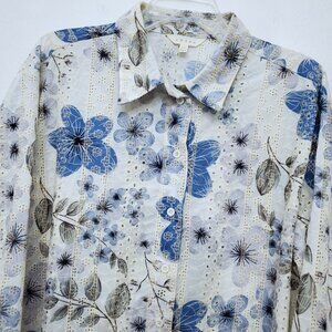 Adiva Cream & Blue Floral Embroidered Women's Button Down Preppy Shirt Size XL