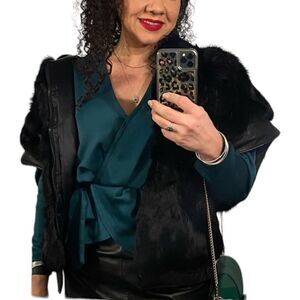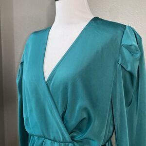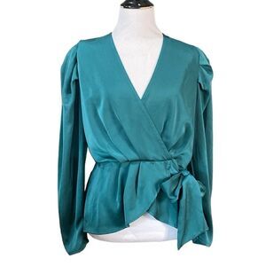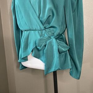 Beautiful green satin peplum faux-wrap top with sash/bow detail.