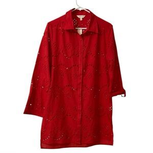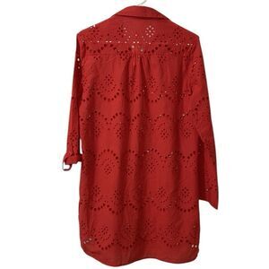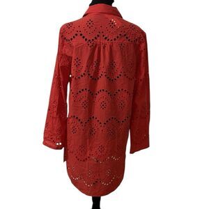 Adiva Eyelet Orange/Red Eyelet Button Down Cotton Tunic Top(Size Medium)