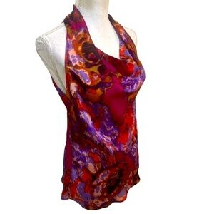 Bold halter blouse with red and purple abstract design. Ideal for a chic outfit.