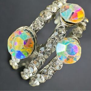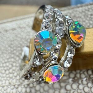 Dazzle your look with this striking adjustable statement ring, featuring three radiant Aurora Borealis crystals that burst with color under the light. The silver-tone band showcases a layered triple design encrusted with clear rhinestones, adding texture, brilliance, and vintage flair. A true cocktail piece that catches every eye.