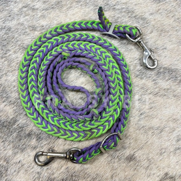 Lightly used 46″ barrel racing style laced connected reins, with conway buckles and snaps at each end, for easy adjustment. Made from a paracord/nylon material that is braided, flat at the bit ends and round with knots at the center. In neon green and purple, in very good used condition. Can go smaller too. Measured from end to center, not total length.