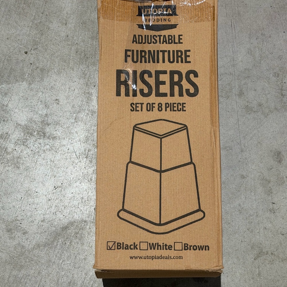 Adjustable bed risers, ideal for dorm room. Eight pieces included to allow for two different height options these were used one year in a dorm room. These are black, heavy duty plastic with NO electrical in them. They are in great shape. Lots of life left.