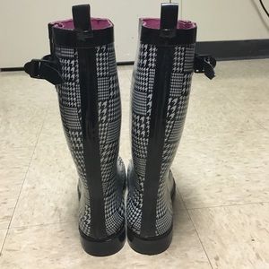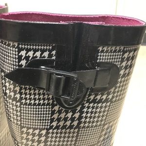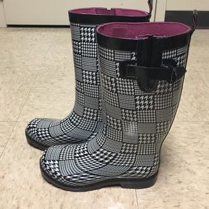 Black and white houndstooth pattern adjustable rainboots with fuschia inside. Good condition.