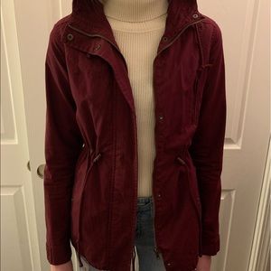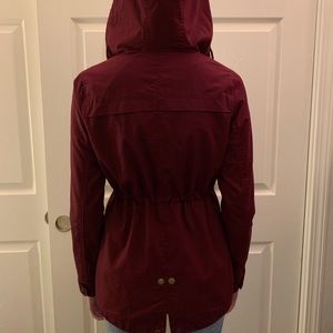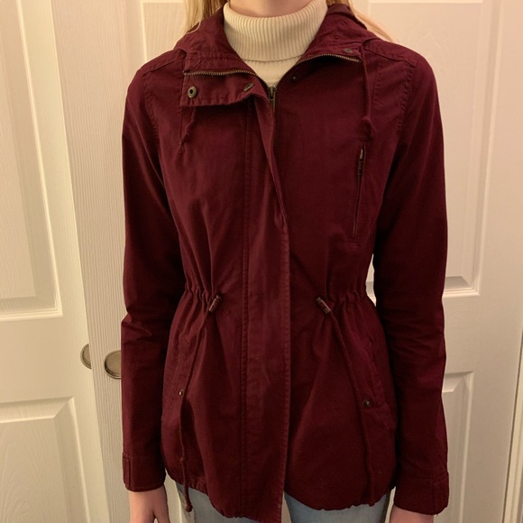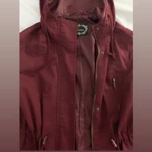 maroon adjustable drawstring utility style rain jacket with hood. adjustable waist and neck. great condition.