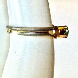 GUC. In good pre-owned condition, this green crystal ring looks like the August birthstone "peridot." The band is gold toned and the metal finish shows wear on the sides and back of the ring. The ring is adjustable from its current size of US 5.