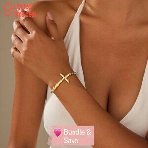 This unique two-tone cross bracelet blends faith-inspired style with versatile, everyday wear. Its textured cross pendant and mixed-metal chain create an edgy yet elegant accessory perfect for daily styling or meaningful gifting.