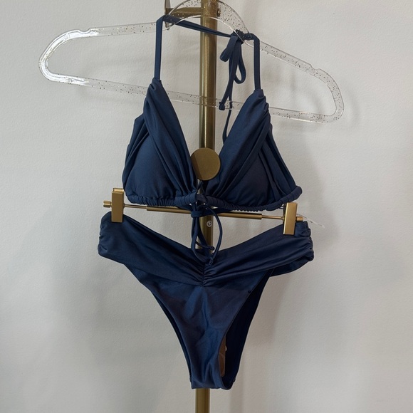 Two-piece halter bikini in navy with adjustable tie closures. Ruched detailing at the cups and waist for a flattering fit. Soft, stretch swim fabric for all-day comfort. Classic navy color for versatile beach styling.