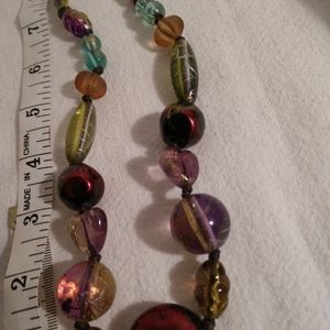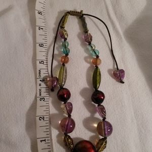 Adjustable Necklace with glass beads featuring reds, pinks, yellows, greens and black.
