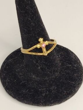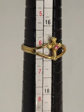 Adjustable Gold Tone and Pink Rhinestone Cross Ring - Currently Set at Size 6.25 - No Markings - Great Condition