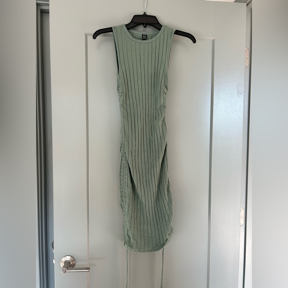 Chic ribbed midi dress. Sleeveless design. Elegant sage color. Ideal for versatile styling. You can adjust the length with the ruched strings.