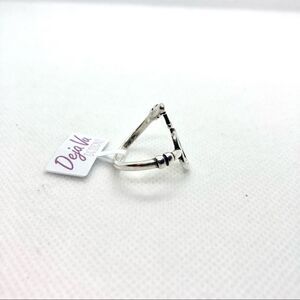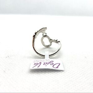 925 stamped open ended ring. Adjustable polished skeleton key open ring; in its current orientation it is approximately a size 7. Ring is sterling silver plated.