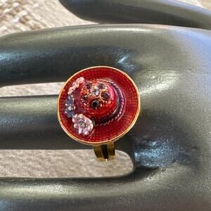 Adjustable, Size 8, Red Hat Society Gold Tone Ring with Three Flowers