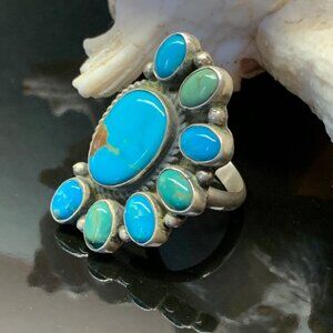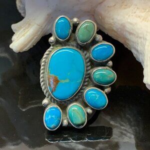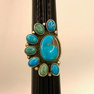 This exceptional half cluster ring was designed and handmade by Geraldine James, Navajo silversmith jewelry artist. It features a larger center cabochon of blue turquoise surrounded by seven smaller oval cabochons of blue and green turquoise. It is stunning.