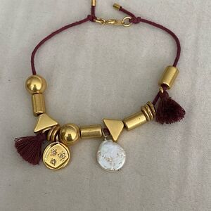 Adjustable bracelet with gold tone beads and mother of pearl accent With tassels