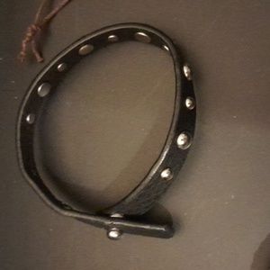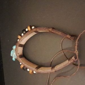 brown and black bracelets made with leather and some beads and silvertone metals one has a turtle.